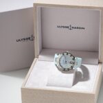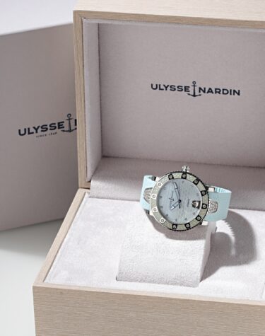 Часы Ulysse Nardin Marine Lady Diver 8103-101E-3C/13 выпущены из нержавеющей стали, размером 40 мм и водонепроницаемостью 100 м, с вращающимся безелем и с корпусом инкрустированным белыми бриллиантами. Внутри корпуса установлен автоматический механизм UN - 810. На голубом жемчужном циферблате отображаются часы, минуты, секунды, дата. Запас хода 42 часа. Часы комплектуются каучуковым ремешком с вставкой из нержавеющей стали и раскладывающейся застежкой.